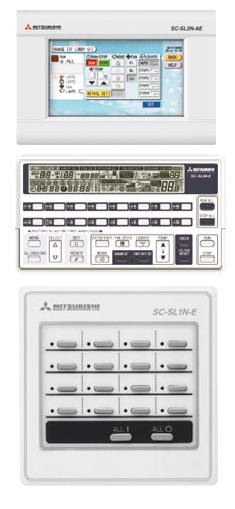 1.ชุดควบคุมแบบง่าย ๆ simple central control : มี 2 แบบให้เลือก แบบมีปุ่มเปิดปิด 16 ปุ่มเพื่อเปิด-ปิด อยู่ใน remote เดียว กรณีเครื่องมีปัญหาจะขึ้นกระพริบให้ คุมแอร์ได้ 16 เครื่อง กับ อีกแบบมี 16 ปุ่ม คุมแอร์ได้ 16 เครื่องเช่นกันแต่สามารถตั้งอุณภูมิ ตั้งเวลาเปิด ปิดรายสัปดาห์ได้ด้วย (ตามรูป 2,3 ด้านซ้ายจากบนลงล่าง)